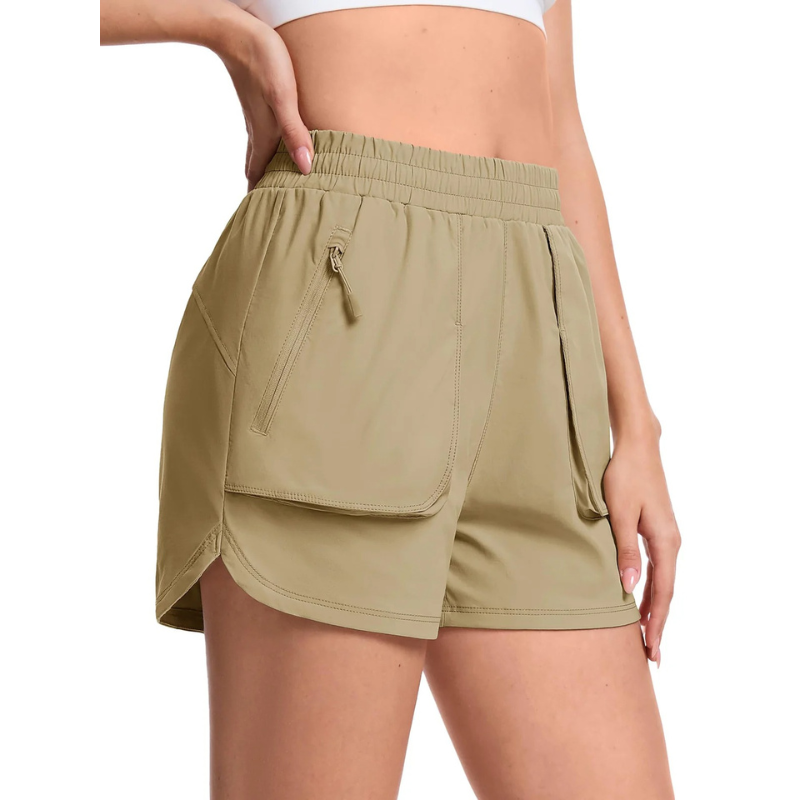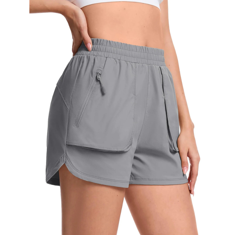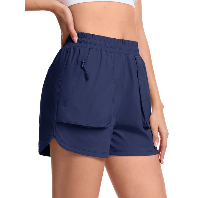 Shorts esportivo feminino leve e respirável, com secagem rápida e ótima absorção de suor. Conta com bolsos com zíper para armazenamento seguro, cós elástico com cordão ajustável e fendas laterais que garantem liberdade total de movimento.