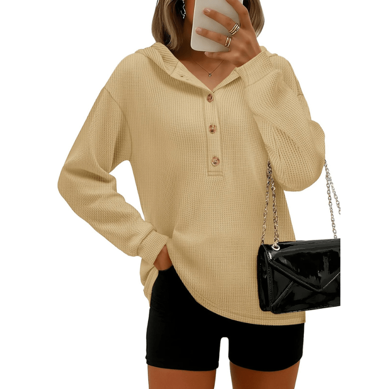 Moletom feminino com capuz em malha waffle, macio e respirável, com textura tridimensional agradável ao toque, oferecendo aquecimento leve para diferentes climas, ideal para as estações de primavera e outono.