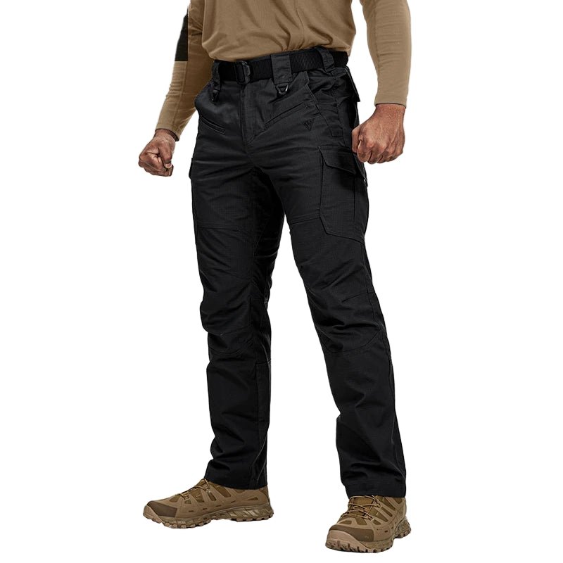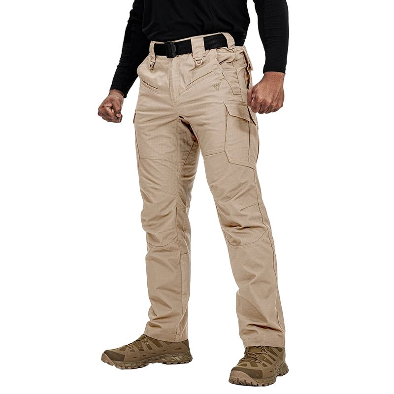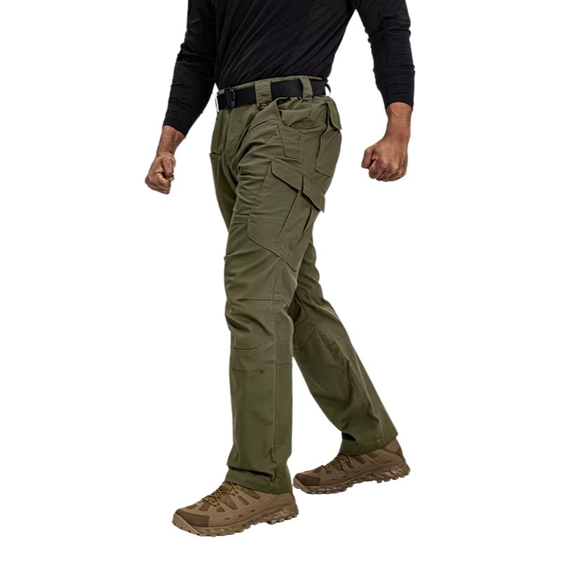 Calça tática masculina em tecido ripstop durável e flexível, resistente a rasgos e com repelência à água.