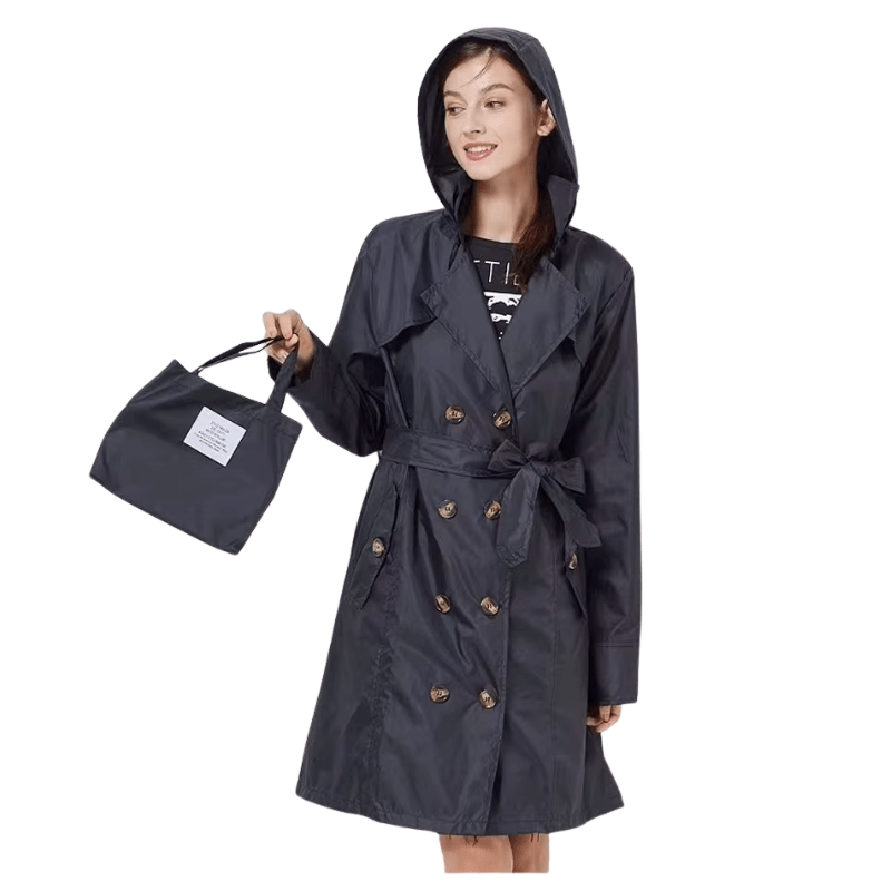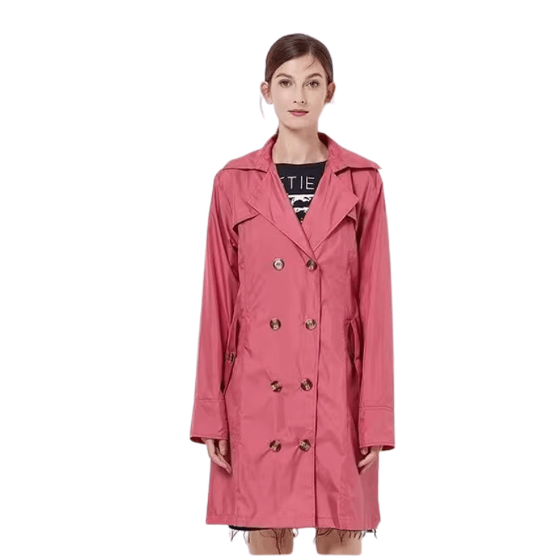 Capa feminina impermeável fina com cinto, modelo longo elegante e confortável.