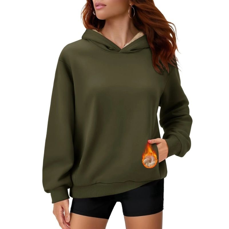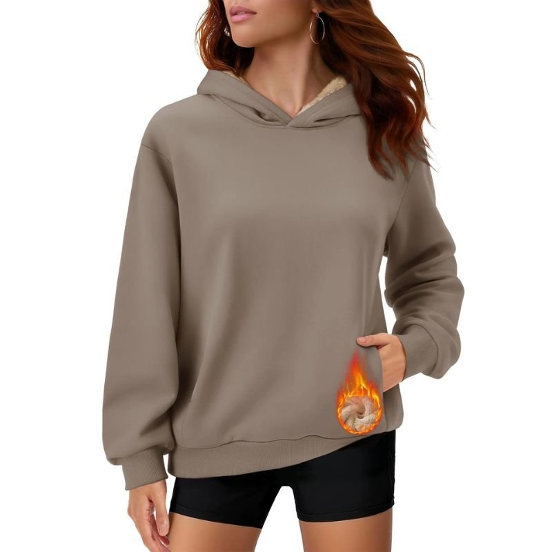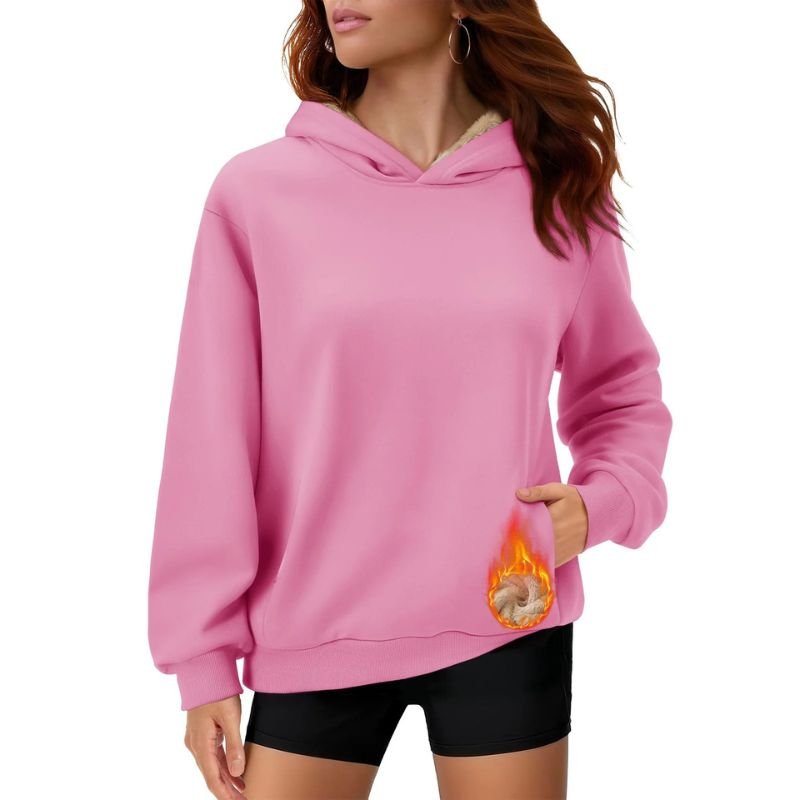 Moletom feminino com capuz e forro interno em lã Sherpa, quente, macio e confortável.