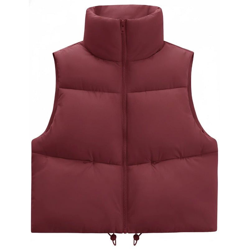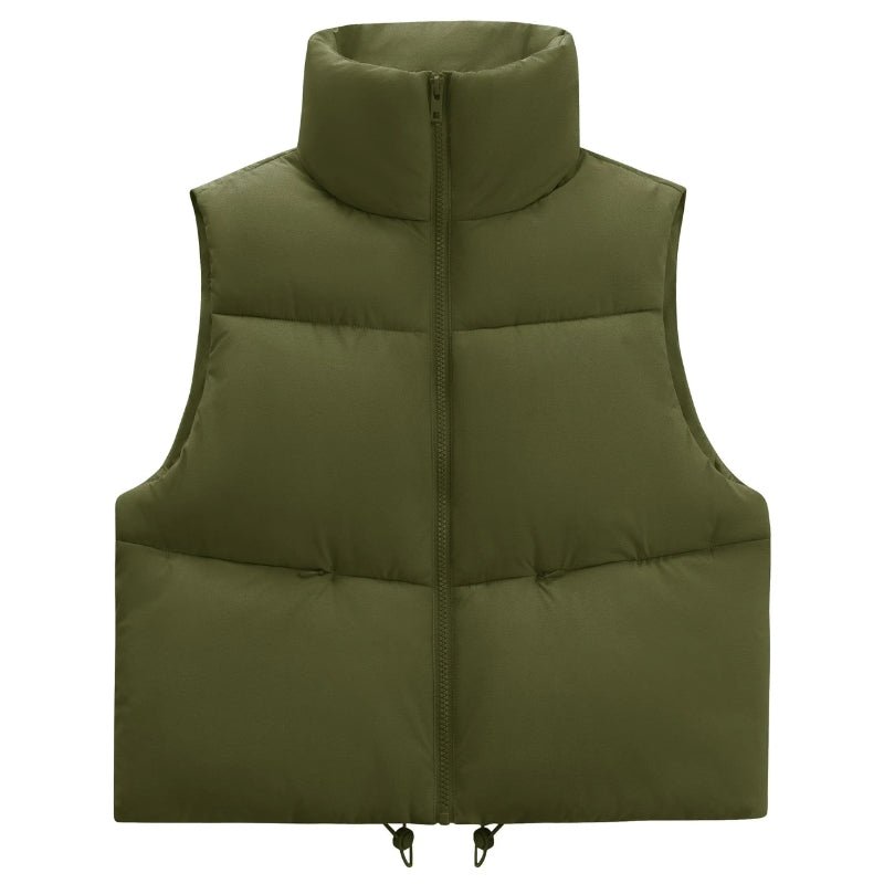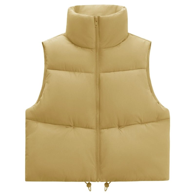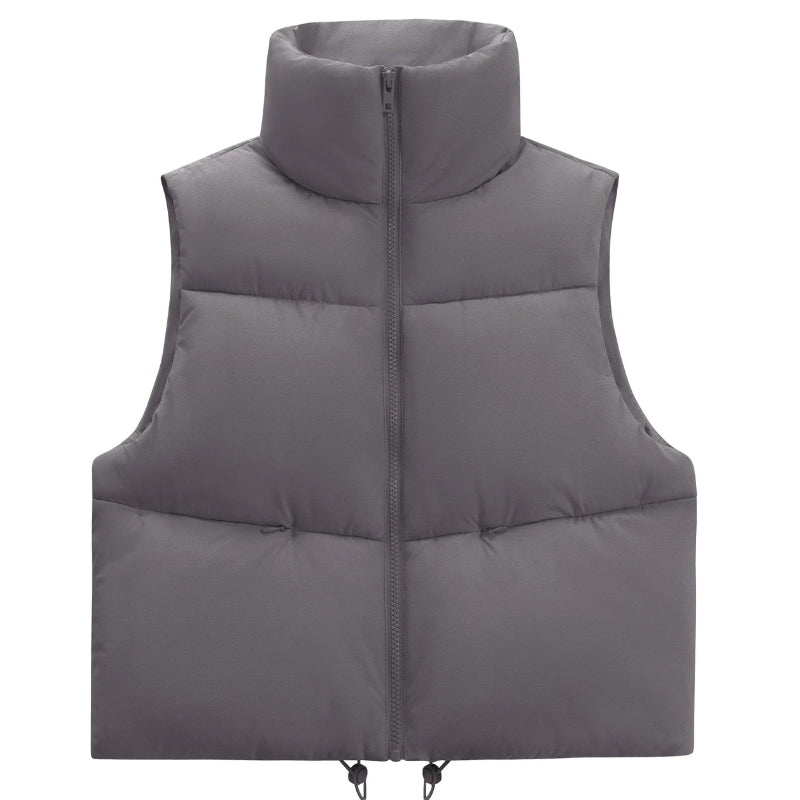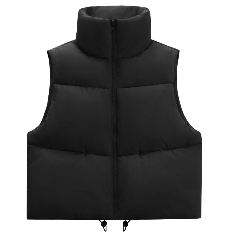Colete puffer cropped feminino, leve com gola alta e fechamento em zíper.