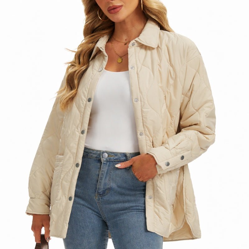 Possui costura ondulada que distribui o enchimento de forma uniforme, garantindo aquecimento sem volume excessivo. Conta com gola de camisa, botões metálicos frontais e nos punhos, bainha em arco com fendas laterais e dois bolsos amplos.